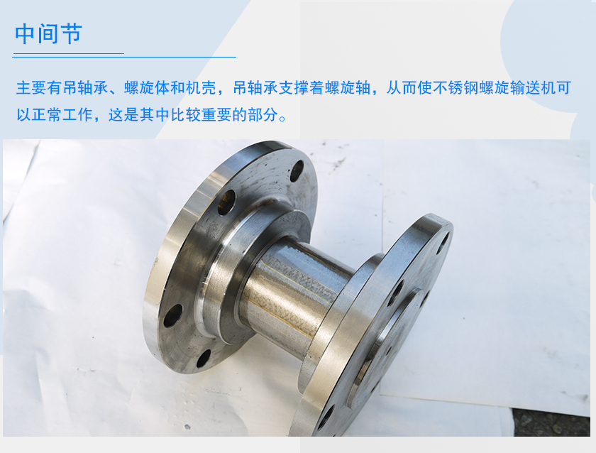中間節:主要有吊軸承、螺旋體和機殼,吊軸承支撐着螺旋軸,從而使不鏽鋼螺旋輸送機可以正常工作,這是其中比較重要的部分。