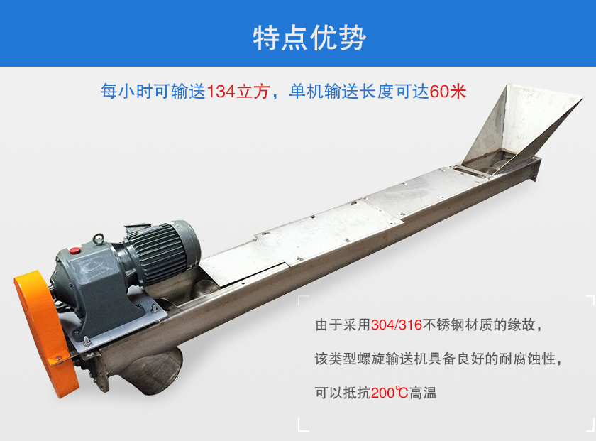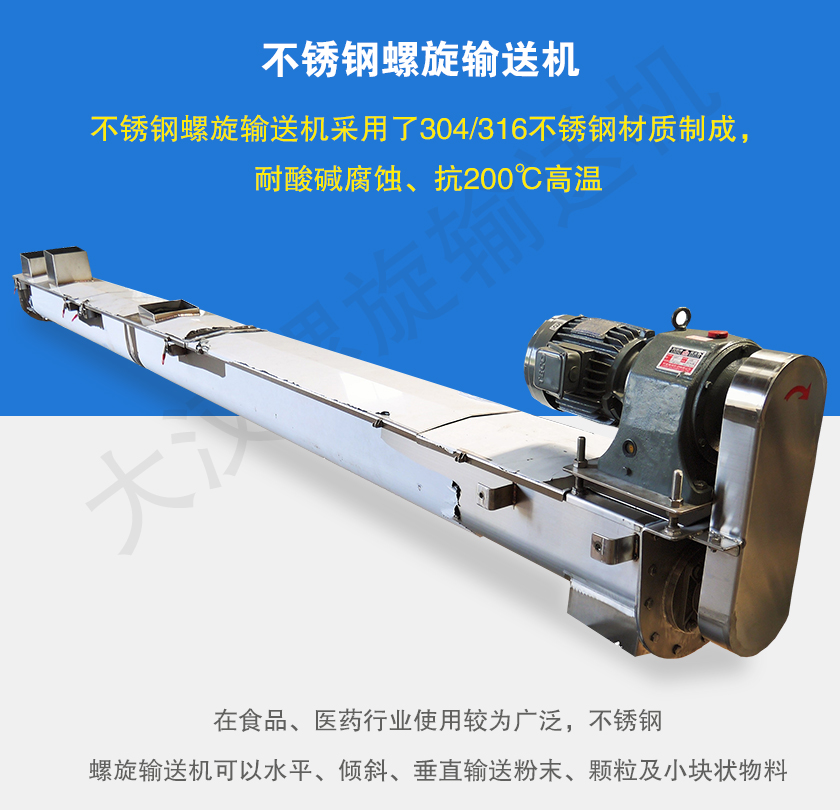 不鏽鋼螺旋輸送機采用了304/316不鏽鋼材質制成,耐酸堿腐蝕、抗200℃高溫、防止機器生鏽而污染到物料,所以在食品、醫藥行業使用較爲廣泛,不鏽鋼螺旋輸送機可以水平、傾斜、垂直輸送粉末、顆粒及小塊狀物料。
