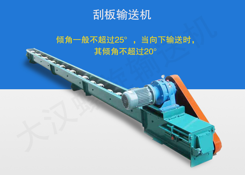 刮闆輸送機是利用固接在牽引鏈上的刮闆在敞開的料槽中刮運散狀物料的輸送機,其牽引構件是刮闆鏈,承載裝置是中部槽,可水平、傾斜輸送機物料,當沿傾斜向上輸送物料時,煤層傾角一般不超過25°,當向下輸送時,其傾角不超過20°,當傾角較大時,可安裝防滑裝置。