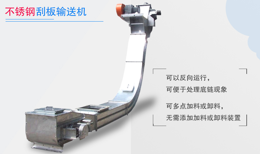 牽引鏈繞過頭、尾鏈輪構成閉合環路,物料可選用上分支或下分支任意輸送,也可用兩分支同時輸送,牽引鏈設計多爲圓環鏈較多。采用一根牽引鏈與刮闆中部聯接,也可用兩根牽引鏈與刮闆兩端聯接,刮闆的形狀有梯形、長方形或長條形三種,分固定式和移置式兩種形态。