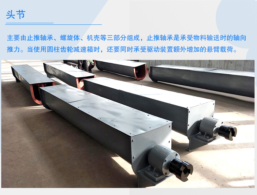 頭節:主要由止推軸承、螺旋體、機殼等三部分組成,止推軸承是承受物料輸送時的軸向推力。當使用圓柱齒輪減速箱時,還要同時承受驅動裝置額外增加的懸臂載荷。