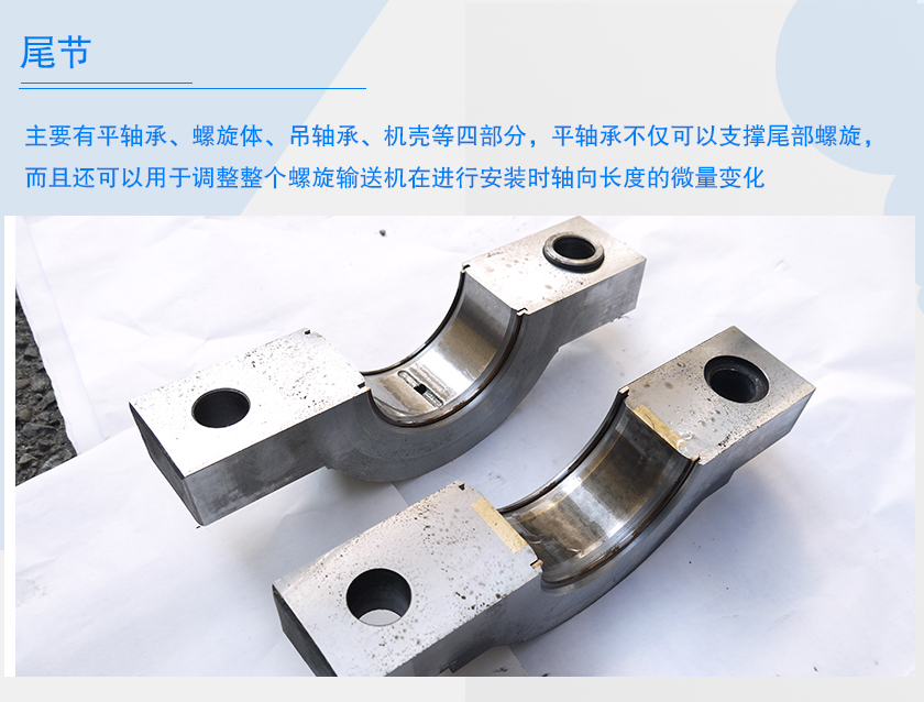 尾節:主要有平軸承、螺旋體、吊軸承、機殼等四部分,平軸承不僅可以支撐尾部螺旋,而且還可以用于調整整個螺旋輸送機在進行安裝時軸向長度的微量變化。