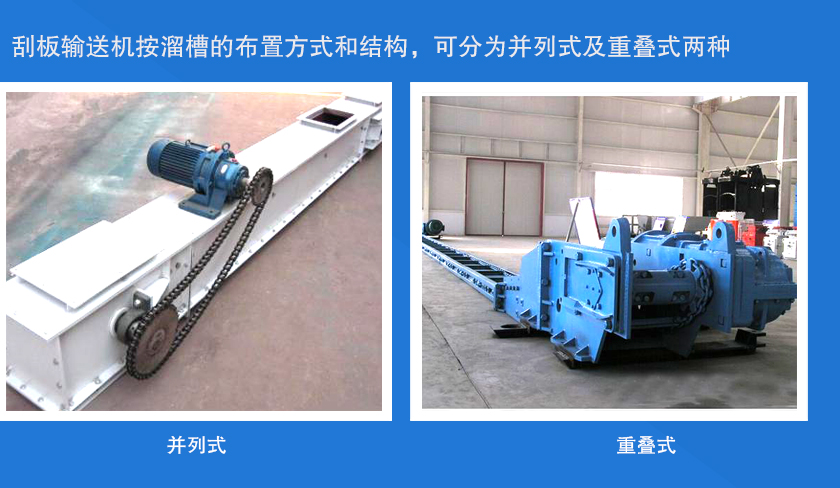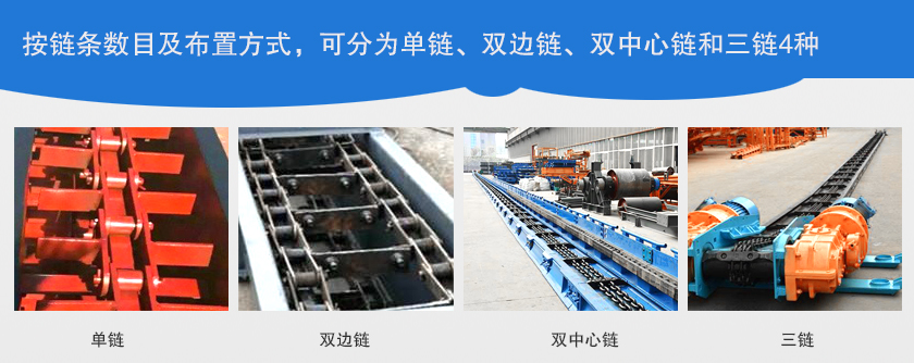刮闆輸送機按溜槽的布置方式和結構,可分爲并列式及重疊式兩種,按鏈條數目及布置方式,可分爲單鏈、雙邊鏈、雙中心鏈和三鏈4種。