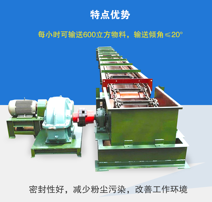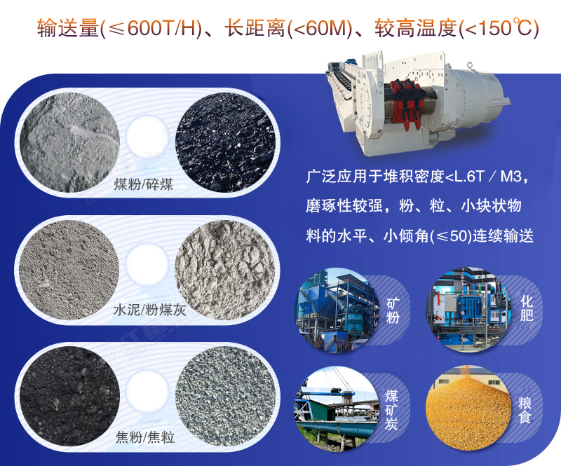 刮闆輸送機廣泛應用于堆積密度<l.6t/m3,磨琢性較強,粉、粒、小塊狀物料的水平、小傾角(≤50)連續輸送,如煤粉、碎煤、水泥、粉煤灰、焦粉、焦粒、礦粉、化肥、糧食等大輸送量(≤600t/h)、長距離(<60m)、較高溫度(<150℃)物料的連續輸送。