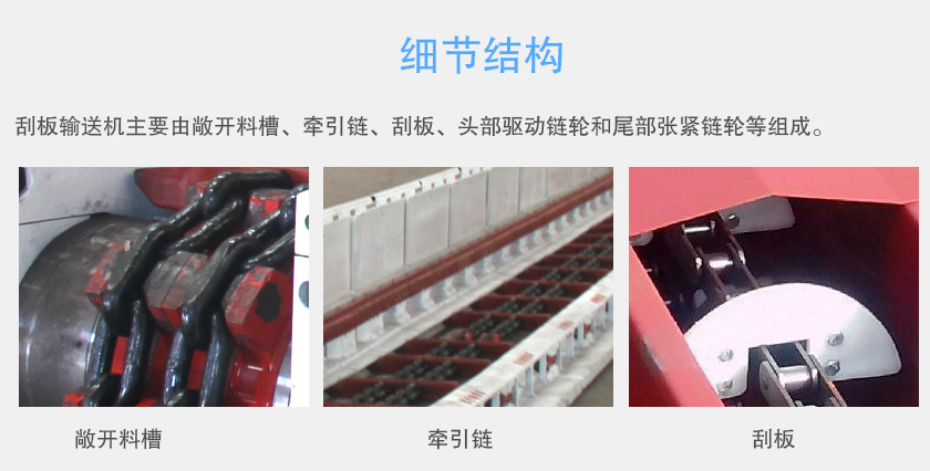 刮闆輸送機主要由敞開料槽、牽引鏈、刮闆、頭部驅動鏈輪和尾部張緊鏈輪等組成。